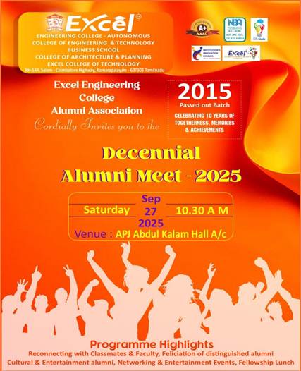 Decennial Alumni Meet – 2025 of the 2015 Passed-Out Batch students conducted at Excel Engineering college on 27.09.2025. This special occasion marks 10 years of memories, friendships, and achievements since graduation of 2015 Passed-Out Batch students.