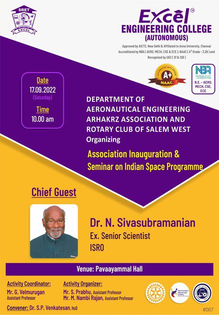 The Department of Aeronautical Engineering is going to conduct Association Inauguration and seminar on Indian space on 17.09.2022 at Pavaayammal Hall.