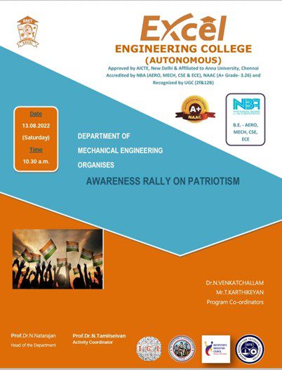 Department of Mechanical Engineering, We are happy to invite u all for the Awareness Rally on patriotism on 13.08.2022 @10:30am.