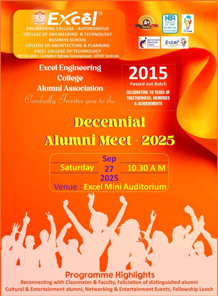 Decennial Alumni Meet – 2025Decennial Alumni Meet – 2025Decennial Alumni Meet – 2025 by 203 203 people viewed this event. Register for event To register for this event email your details to arunraj@springboarddigital.com Register using webmail: Gmail / AOL / Yahoo / Outlook Date And Time 2025-09-27 @ 10:30 AM Location Excel Mini AuditoriumShare With Friends Facebook Twitter Linkedin Xing Pinterest