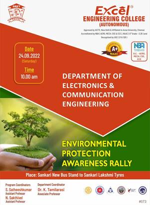 Department of Electronics and Communication Engineering conducting Environmental Protection Awareness Rally on 24.09.22 @10am. Venue : Sankari New Bus stand to sankari Lakshmi Tyres
