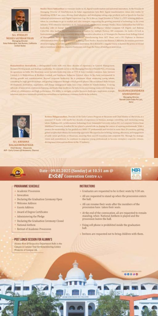 Graduation dayGraduation dayGraduation day by 1910 1910 people viewed this event. Register for event To register for this event email your details to arunraj@springboarddigital.com Register using webmail: Gmail / AOL / Yahoo / Outlook Date And Time 2025-02-09 @ 10:30 AM Location Excel Engineering CollegeShare With Friends Facebook Twitter Linkedin Xing Pinterest