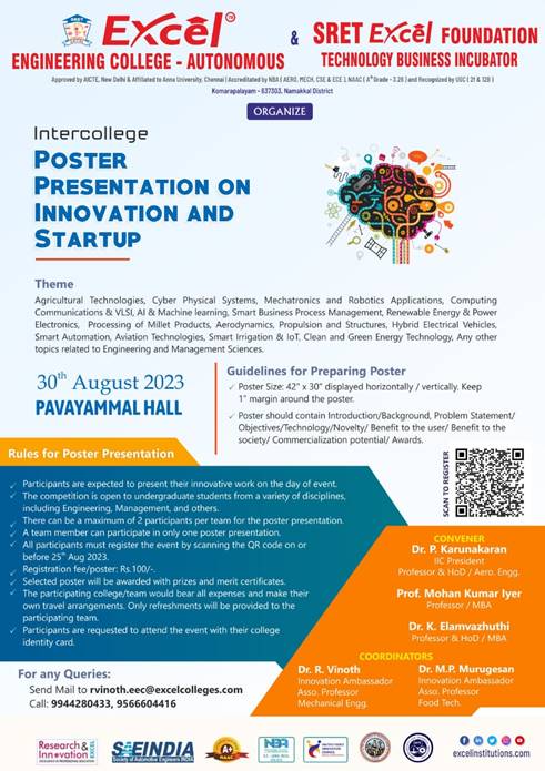 Excel Engineering College (Autonomous) & SRET Excel Foundation Technology Business Incubator, Komarapalayam, Namakkal District, Tamil Nadu, jointly organizing Inter College Poster Presentation on “Innovation and Startup” on 30.08.2023 at Paavaiammal Hall.