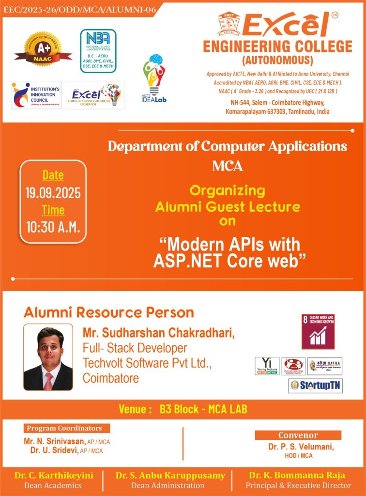 Modern API’s with ASP .NET Core WebModern API’s with ASP .NET Core Web Modern API’s with ASP .NET Core Web by 497 497 people viewed this event. Register for event To register for this event email your details to arunraj@springboarddigital.com Register using webmail: Gmail / AOL / Yahoo / Outlook Date And Time 2025-09-19 @ 10:30 AM Location B3 Bloack MCA Lab - Excel Engineering CollegeShare With Friends Facebook Twitter Linkedin Xing Pinterest