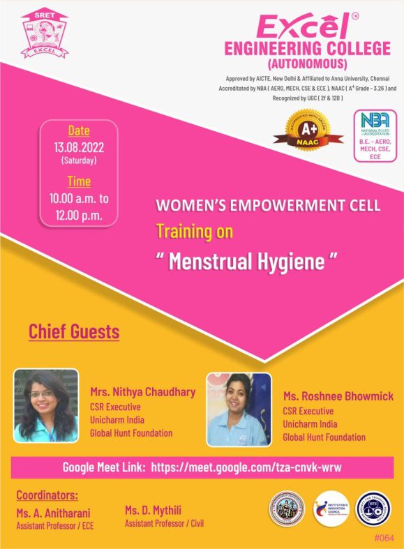 Excel Engineering College, Women’s Empowerment Cell Training on “Menstrual Hygiene” on 13.08.2022 @10am through Online Mode.