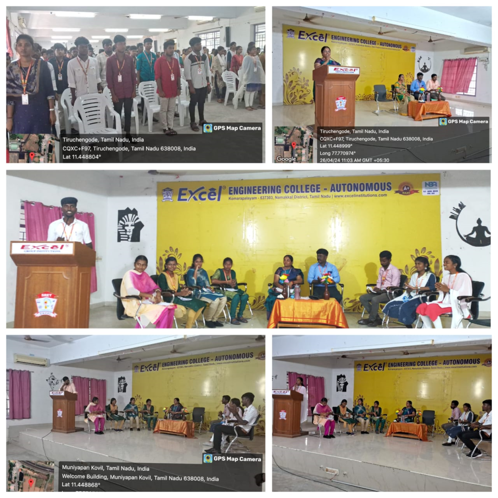 எக்ஸல் பொறியியல் கல்லூரியில் பாவேந்தர் பாரதிதாசன் நினைவு தினத்தை முன்னிட்டு இன்று (26.04.2024) காலை 10.30மணியளவில் முனைவர் மு.நடராஜன் உதவிப்பேராசிரியர் /தமிழ் ஒருங்கிணைப்பில், அறிவியல் மற்றும் மானுடவியல்