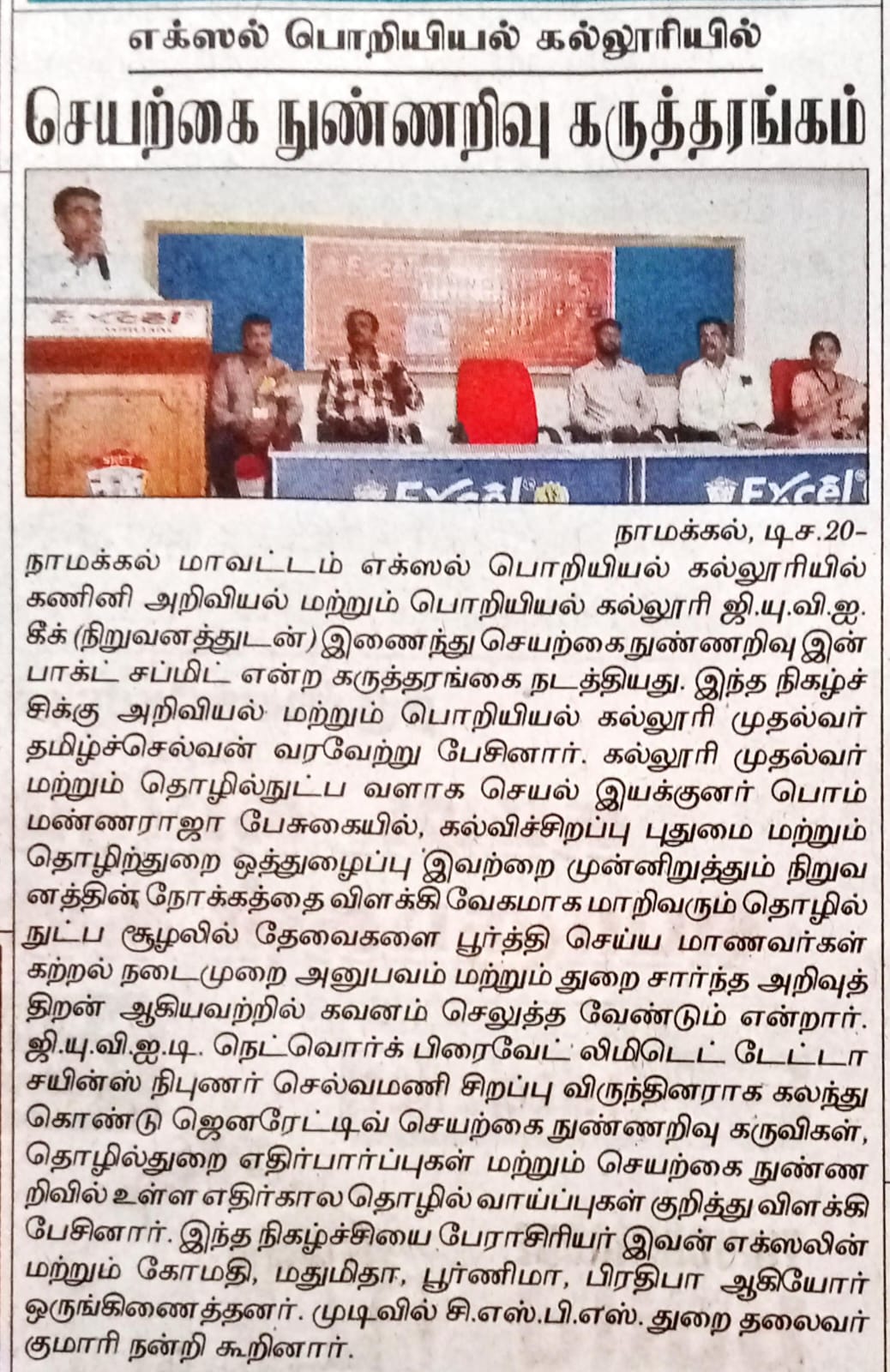 Press ReleasesPress ReleasesArtificial intelligence seminar at Excel Engineering College. Kupalayam Excel Engineering College signs MoU with ‘Hire Me’ Introductory program for students at Excel Engineering College Orientation Programme Commencement ceremony of classes for first year students Awareness program for coordinators at K. Palayam Excel Engineering College Great Praise for the State Autonomy Hero International Conference on Computer Solutions for Sustainable Development at Excel Engineering College 18th Annual Sports Festival at Excel Engineering College Excel Engineering College signs agreement with private companies Graduation ceremony for students at Kumarapalayam Excel Educational Institute Republic Day Celebration 2-Day’s Smart India Hackathon 2024 Excel Engineering College signs agreement with private company Smart India Hackathon 2024 Order to start a business incubator Inauguration of Teacher Development Training Workshop Energy conservation awareness Independence Day Celebration at Excel Educational Institutions Plastic Eradication Cleanliness Camp National Level Seminar at Excel College of Engineering Technology Exhibition Annual Day Celebration Founder’s Day Celebration National Workshop at ExceL College of Engineering World Cancer Day How to build in hilly terrain? National Science Day Graduation Day Celebration Employment Camp International Mother Language Day Seminar National Education Day Celebration Award to the Vice President of Excel Educational Institutions National Mathematics Day Celebration at Excel Engineering College Knowledge Skills Competition of Students State Level Sports Competition World Environment Day Plastic Eradication Awareness Rally Entrepreneurship Development Training Students Education Skill Competition Annual Day Celebration