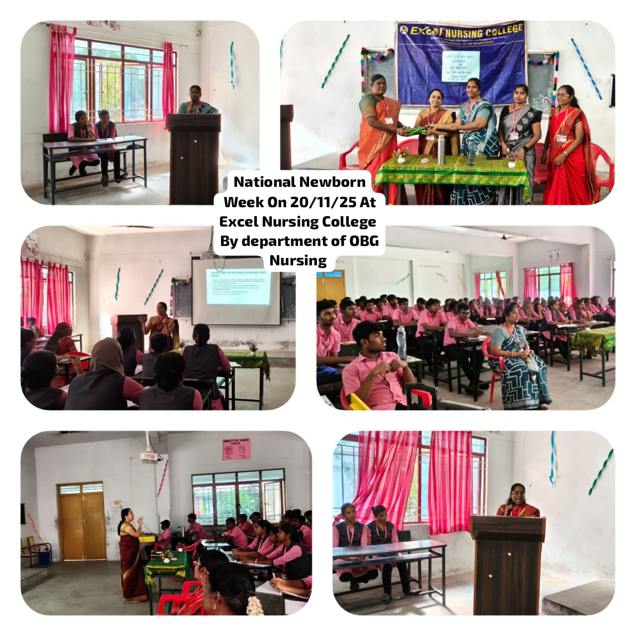 National Newborn week was conducted by obstetrical and Gynecological Nursing department Excel Nursing College on 22/11/2025. The Programme was started at 2.00 pm. Welcome speech was delivered by Mrs.P.Shenbagam, Nursing tutor, Dr.SREEVIDHYA.JS.MD Professor, Department of OBG from Excel Homeopathy medical college, was invited as the Chief Guest of this Program, Mrs.K.Vasanthapriya Associate Professor gave the speech on significance of the day was “ Healthy Beginnings Hopeful Futures. “Mrs.R.Sasikala, nursing tutor gave the vote of thanks. Around 120 Students (B.Sc Nursing 3rd year & DGNM II Year) were benefitted in this programme.